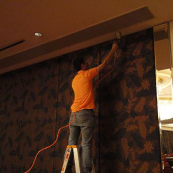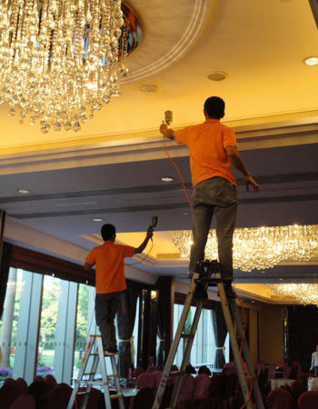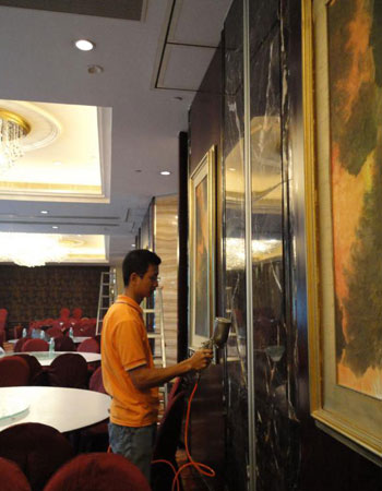 3、表面清潔,用干凈的拖把將宴會(huì)廳的表面(除玻璃這外)擦一遍,用吸塵機(jī)將地毯上的臟物清理掉,主要目的去除表面的塵埃,確保光觸媒涂層的粘著能力,以免影響其效果;