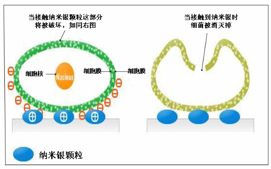 帶正電荷的納米銀顆粒接觸到帶負電荷的細菌細胞后,會相互吸附,它能有效擊穿細胞膜,在細胞內(nèi)發(fā)生反應,造成蛋白質(zhì)凝固,使細菌合成酶的活性遭到破壞,干擾細菌DNA的合成,使細菌喪失分裂增殖能力而死亡與此同時銀離子和蛋白質(zhì)的結(jié)合還破壞了細菌的呼吸系統(tǒng),物質(zhì)傳輸系統(tǒng)。銀離子殺死細菌后,又會從細菌的尸體游離出來,沒有任何消耗,仍保持原有的抗菌能力,因此納米銀的抗菌能力可長期有效。通過納米技術處理后的銀表面急劇增大,能擴大與病菌和真菌接觸的表面積,加強了抗菌和抗真菌的功效。如下圖所示: