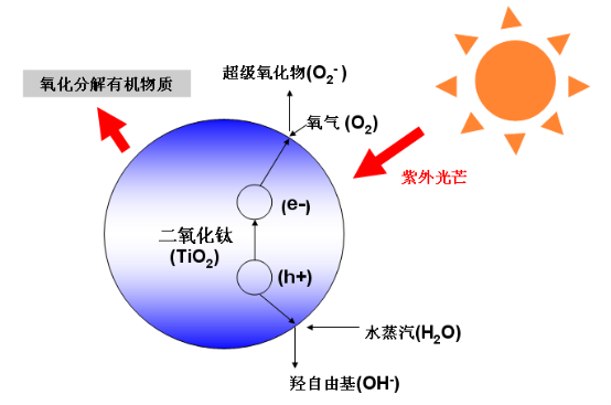 銀康的光觸媒二氧化鈦在紫外光照射條件下起作用,它能在室溫下分別與水蒸氣和氧氣發(fā)生反應產(chǎn)生羥自由基和超級氧化物,而羥自由基和超級氧化物具有超強的氧化性,能氧化分解空氣中的有機物質(zhì),可使微生物體內(nèi)大分子的核酸、蛋白質(zhì)和DNA等發(fā)生過氧化反應,并導致細胞不可逆的直接損傷而死亡,最終將細菌氧化成CO2、H2O和微量無機鹽,實現(xiàn)了零環(huán)境污染的綠色消除微生物污染的目的。 如下圖所示: